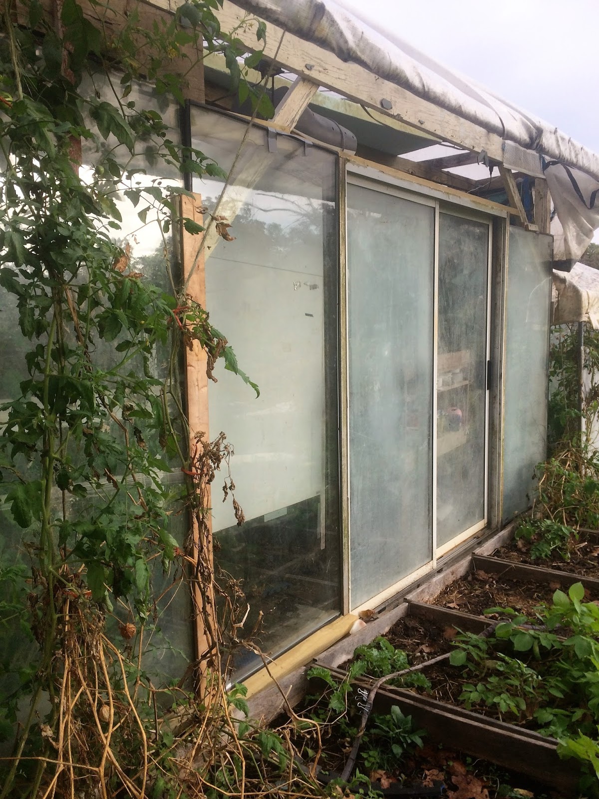 Speaking on the High Tunnel, the tunnel was built using mostly recycled materials. When we first started, it was made from corrugated clear roofing on a lathe arbor. Slowly over the years and after our first Slow Food Grant, Bill has expanded and slowly replaced all that with double wall Thermoclear and recycled glass doors, windows, tarps Etc.